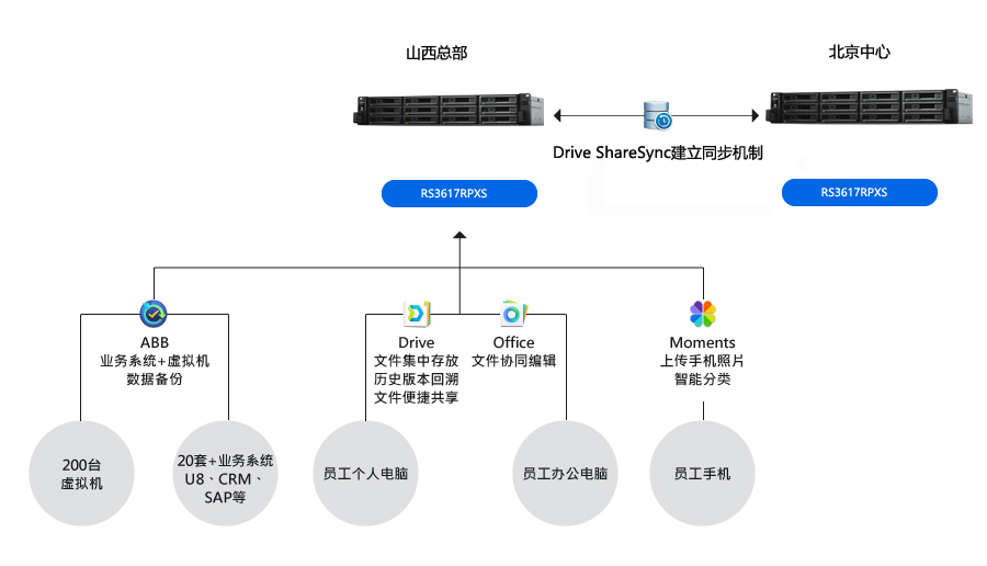一份備份數(shù)據(jù)對公司的安全需求來說還不夠,借用群暉又進一步打造了異地備份容災(zāi)方案。振東制藥山西總部的 RS3617RPXS 的備份數(shù)據(jù),通過群暉 Drive ShareSync多分點同步功能復(fù)制到北京分公司的 RS3617RPXS 中。支持排程備份計劃。