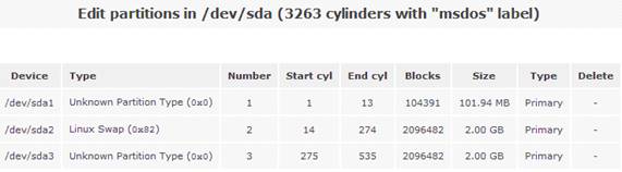 然后點擊磁盤“/dev/sda”,系統(tǒng)會顯示當前磁盤的詳細分區(qū)信息。如圖